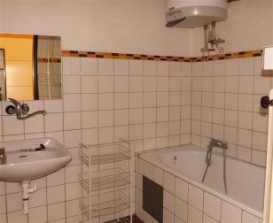 Nabízíme k pronájmu prostorný byt se dvěma neprůchozími pokoji v přízemí v historické činžovní vile Rusalka s pěti byty. Dům je přímo v Říčanech naproti nemocnici. Kuchyně a pokoj č. 1 (obývací pokoj) jsou směrem do ulice a mají výhled do předzahrádky. Pokoj č. 2 (ložnice s velkou hnědou šatní skříní) je s výhledem do zahrady. Zahrada není přístupná. V obou pokojích jsou parkety. Nová plastová okna a nové vnitřní dveře v celém bytě. Osvětlovací tělesa a garnyže se závěsy ve všech 3 místnostech. Ve velké kuchyni, která může sloužit i jako obytná, je úzká šedá skříň, kuchyňská linka a plynový sporák. Koupelna je s vanou, WC je samostatné. V předsíní jsou dvě policové skříně. Ústřední topení plynový kotel Junkers pouze pro tento byt. Rychlé spojení s Prahou vlakem. Městský autobus č.2 , který je zdarma má zastávku nedaleko domu a jezdí na říčanské vlakové nádraží. K ceně nájmu je třeba připočíst zálohu na služby 800,Kč/osoba/měsíc (vodné, popelnice, úklid a osvětlení domu) + náklady na elektřinu a plyn, které si nájemce přihlašuje na sebe a hradí přímo dodavateli. Poslední nájemce měl náklady na plyn 2.230 Kč měsíčně na na elektřinu 1.640 měsíčně. Celkové měsíční náklady případě jedné osoby by tedy při standardní spotřebě neměly přesáhnout 20. 000,Kč a u dvou osob pak 21.000,Kč.