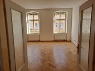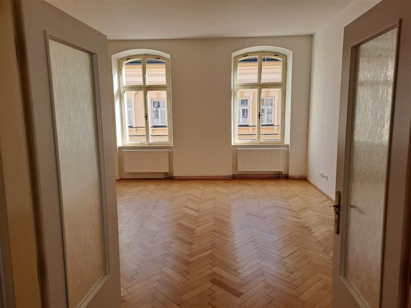 Dispozice: Z předsíně jsou samostatné vstupy do jednoho pokoje (ložnice č.1) a kuchyně. Z kuchyně je pak vstup do velkého obývacího pokoje a z toho do dalšího pokoje (ložnice č.2). Z kuchyně je rovněž vstup do velké šatny a do koupelny s vanou. Z koupelny je vstup na WC. Vzhledem k této dispozici je byt vhodný i pro spolubydlení. Ideální pro dvě samostatné osoby nebo i pro dva páry. Majitel domu preferuje nájemce bez domácích mazlíčků. Využívat byt pro krátkodobé podnájmy nelze.