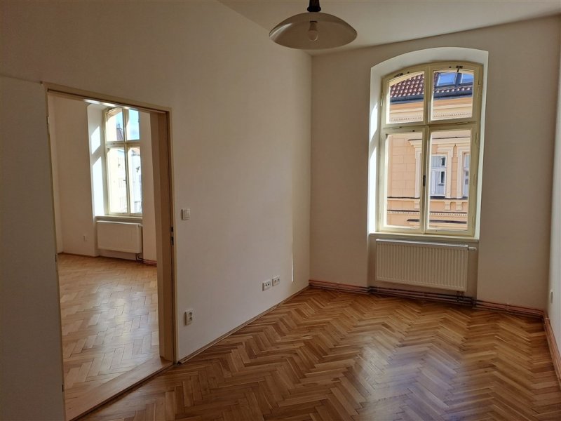 Dispozice: Z předsíně jsou samostatné vstupy do jednoho pokoje (ložnice č.1) a kuchyně. Z kuchyně je pak vstup do velkého obývacího pokoje a z toho do dalšího pokoje (ložnice č.2). Z kuchyně je rovněž vstup do velké šatny a do koupelny s vanou. Z koupelny je vstup na WC. Vzhledem k této dispozici je byt vhodný i pro spolubydlení. Ideální pro dvě samostatné osoby nebo i pro dva páry. Majitel domu preferuje nájemce bez domácích mazlíčků. Využívat byt pro krátkodobé podnájmy nelze.